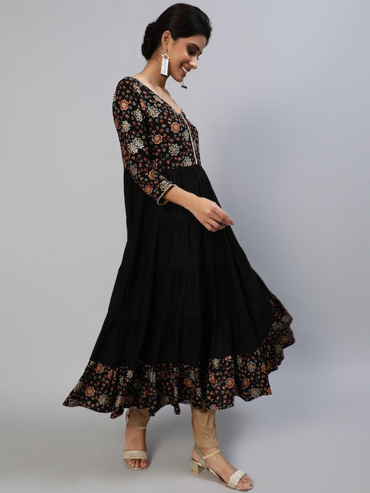 AKS Couture Floral Printed Tiered Anarkali Kurta