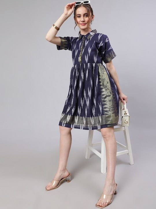 AKS Navy Blue Abstract Printed Shirt Collar Fit & Flare Dress