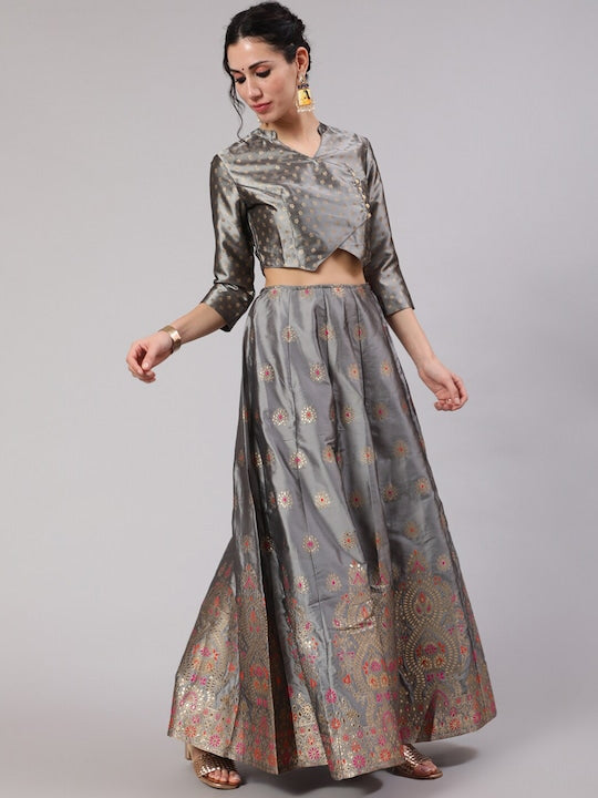 - Grey and red woven design lehenga choli with dupatta, featuring zari ornamentation.