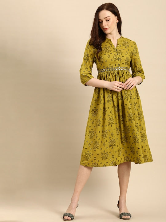 All about you Green Ethnic Motifs Printed A-Line Dress