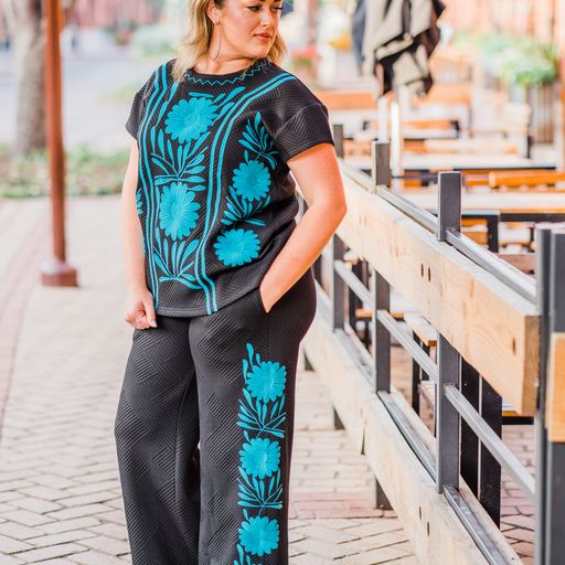 This is the shirt you will want to live in this fall & winter! The Annie sweatshirt is so soft and cozy great for going out or staying in. These top features turquoise embroidery and pairs perfectly with our Oakley Sweatpants.
