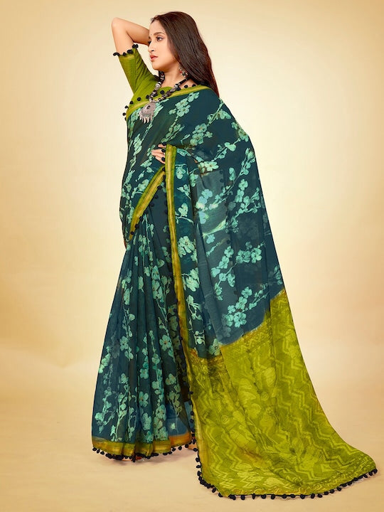 - Floral printed saree with zari border