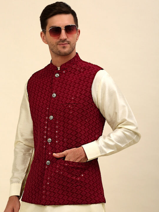 - Maroon embroidered regular-fit nehru jacket, has a mandarin collar, a button closure, sleeveless and three pockets