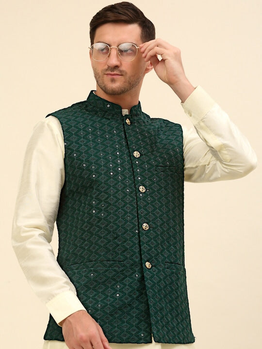 - Green embroidered nehru jacket, has a mandarin collar, a full button placket, sleeveless, three pockets
