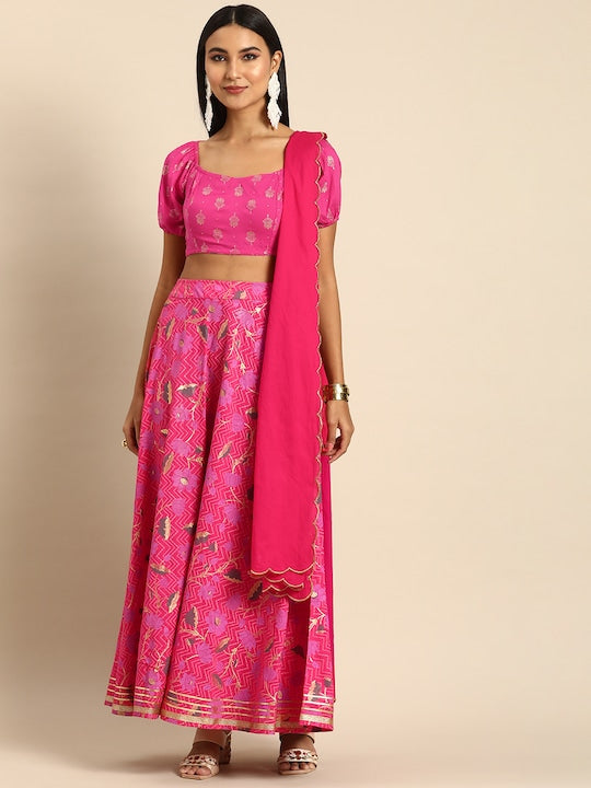 - Pink and gold-toned printed lehenga choli with dupatta,
