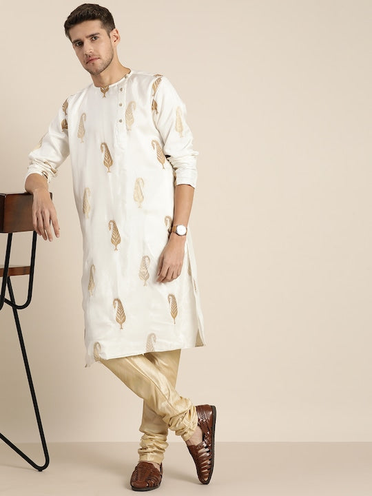 Vastramay Men White & Golden Paisley Printed Kurta with Churidar