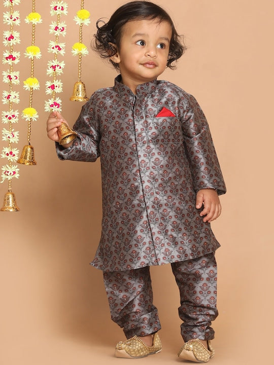 Vastramay Sishu Infant Boys Grey & Maroon Ethnic Motifs Printed Kurta with Churidar