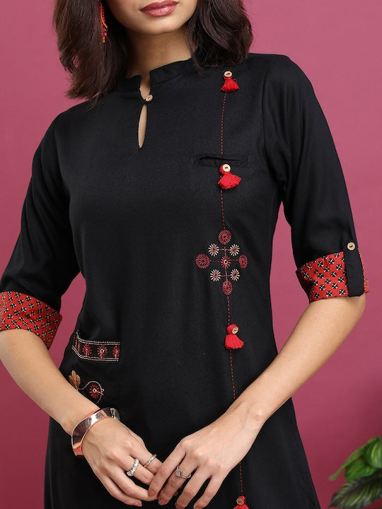 - Black and red calf-length kurta featuring ethnic motifs embroidered on the mandarin collar.