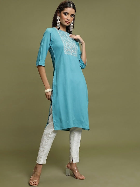 Vishudh Blue Floral Yoke Design Thread Work Straight Kurta