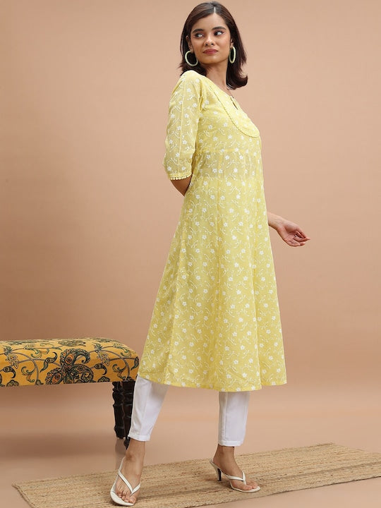 - Yellow and white floral embroidered Anarkali kurta featuring a keyhole neck and three-quarter regular sleeves, offering a vibrant and elegant look.