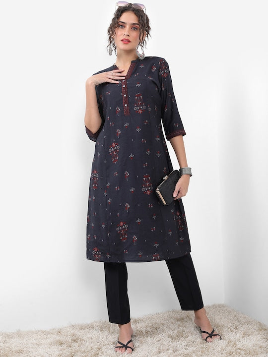 - Embrace elegance in this black and red floral printed kurta with a mandarin collar and three-quarter sleeves.