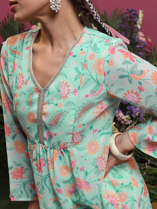 - Green, pink, and orange floral printed Anarkali kurta with angrakha-style detailing for a vibrant and ethnic look.