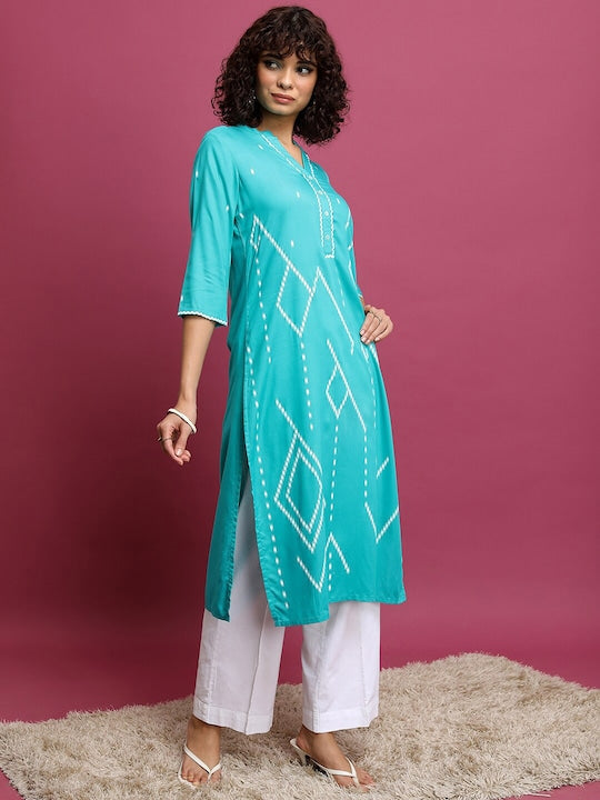 Vishudh Turquoise Blue Geometric Printed Mandarin Collar Straight Kurta