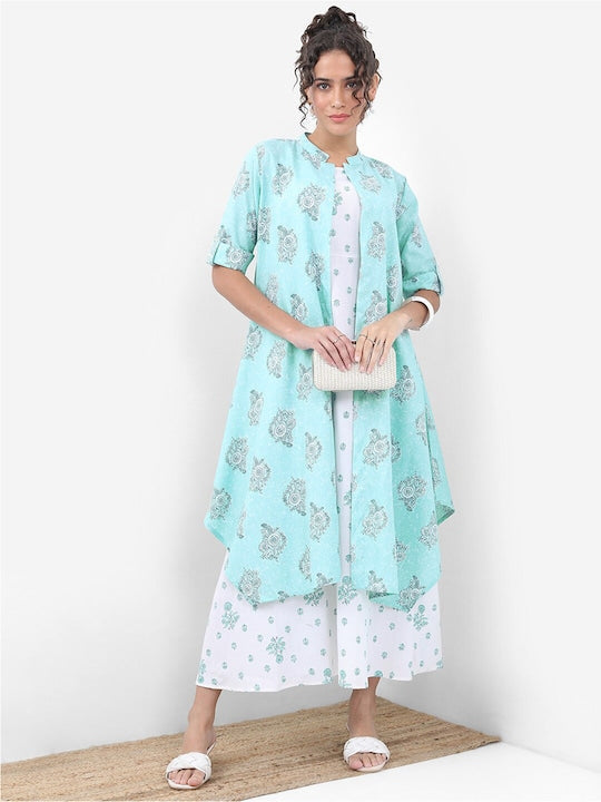 Vishudh White Floral Printed Fit & Flare Midi Dress With Jacket