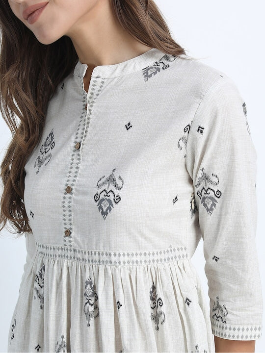 Vishudh Women Cream-Coloured & Grey Ethnic Motifs Cotton Empire Dress