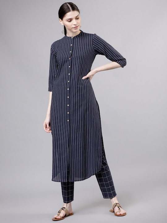 - Make a statement in this classic navy blue and off-white striped kurta set.