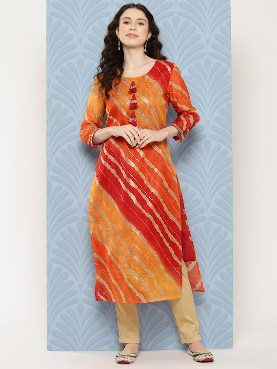 - Embrace a sunny disposition with this yellow Leheriya printed dress, featuring a round neck, three-quarter sleeves, and a straight silhouette that falls to calf length.